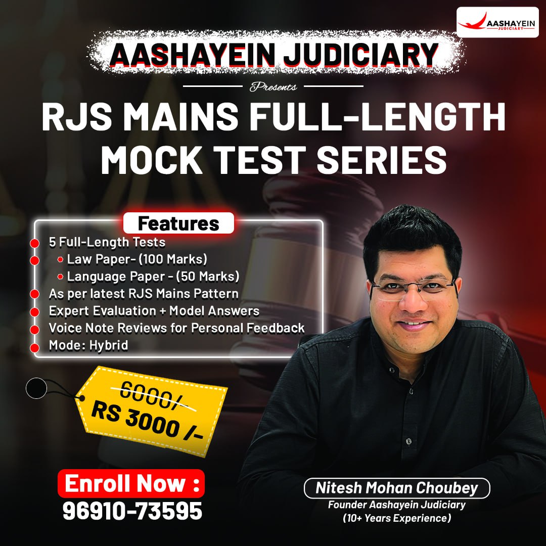 Crack Rajasthan Judiciary 2025 with confidence! Enroll now for Aashayein Judiciary’s RJS Test Series – Sectional & Full-Length Mock Tests with expert evaluation, model answers, and personalized voice note feedback. Call 96910-73595 to book your slot today and secure your success!
